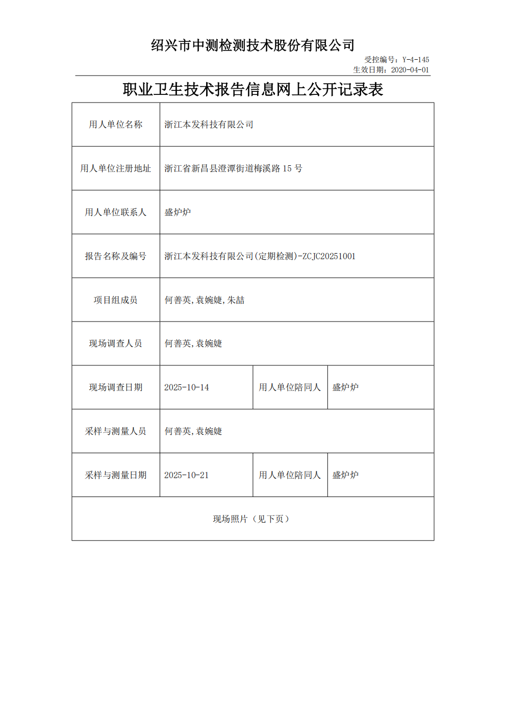 ZCJC20251001_浙江本发科技有限公司职业卫生检测与评价报告网上公开表_浙江本发科技有限公司(定期检测)